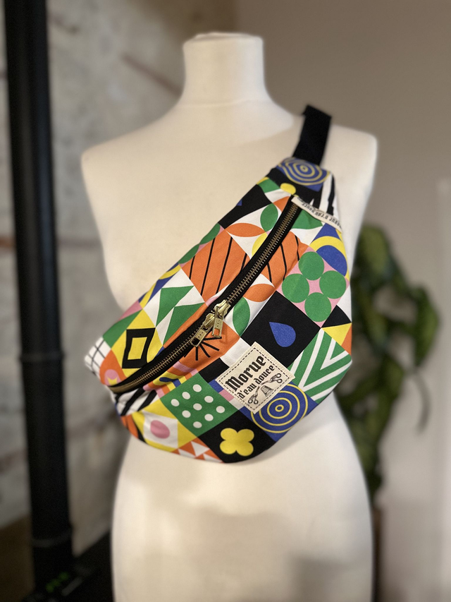 Sac banane taille M 40 cm x18 cm Ouverture double zip en laiton Sangle en coton, tour : min : 81 cm max : 124 cm Boucle attache en plastique Sac lavable en machine à 30°.