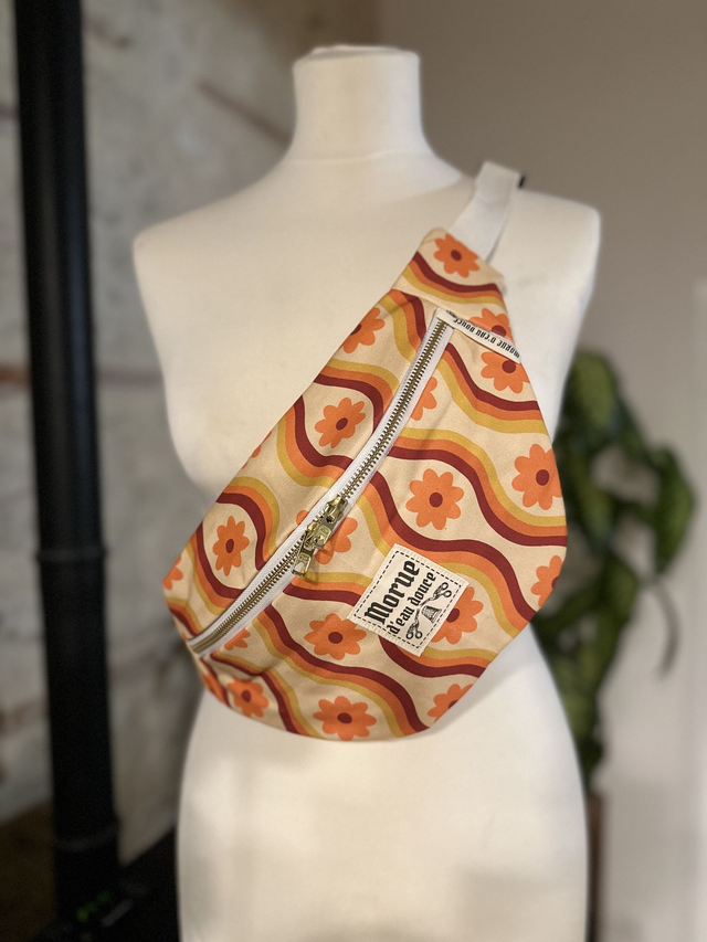 Sac banane taille M 40 cm x18 cm Ouverture double zip en laiton Sangle en coton, tour : min : 81 cm max : 124 cm Boucle attache en plastique Sac lavable en machine à 30°.